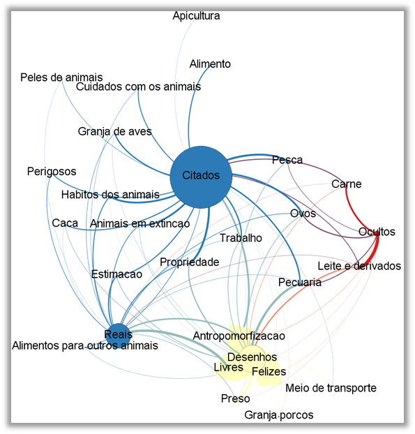 Após essa primeira organização, a qualidade dessas aparições mereceu o perquirir e, desse exercício, as 503 menções a animais foram classificadas de acordo com 24 enunciações identificadas, são essas: Alimento; Alimentos para outros animais; Animais em extinção; Antropomorfização; Apicultura; Caça; Carne; Cuidados com os animais; Estimação; Felizes; Granja de aves; Granja porcos; Hábitos dos animais; Leite e derivados; Livres; Meio de transporte; Ovos; Pecuária; Peles de animais; Perigosos; Pesca; Preso; Propriedade e Trabalho.
