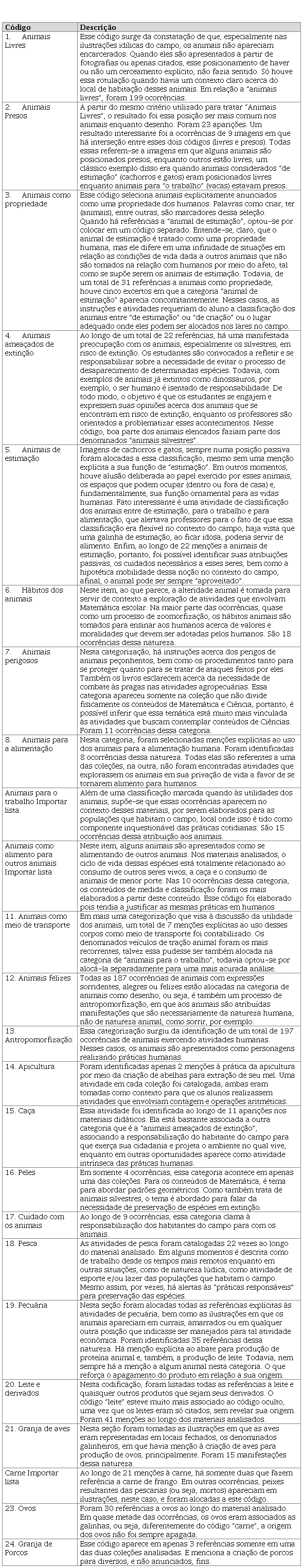 O primeiro exercício será apresentar as codificações elaboradas. Como já anunciado, os animais foram primeiramente categorizados em quatro formas de aparição: desenho, citados, reais e ocultos. Esse procedimento foi elaborado para abordar as maneiras como os animais são posicionados nesse material, principalmente quando se leva em conta o público alvo desses materiais: crianças cursando os anos inicias do Ensino Fundamental, ou seja, indivíduos que, em geral, têm entre 5 e 11 anos. Na sequência, os 24 códigos são descritos e organizados no Quadro 1 para, depois disso, comporem as análises realizadas.