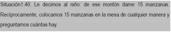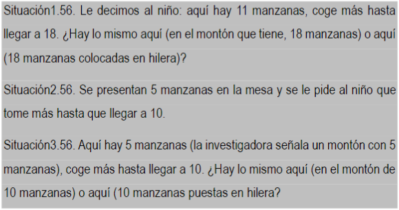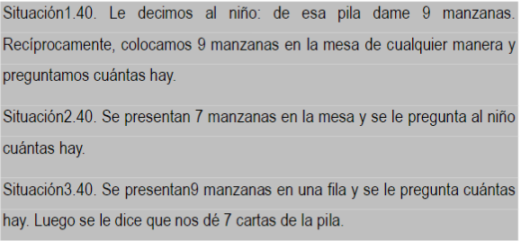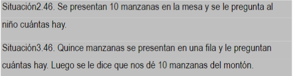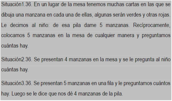 Si el alumno no realiza correctamente la situación1, se pasa la situación2, que también implica el número cardinal, pero es más fácil que la situación1. Si la situación2 no se realiza correctamente entonces el diagnóstico es que el alumno no está en el nivel correspondiente y luego se analizan los errores. Si, por el contrario, la situación2 se lleva a cabo correctamente le pasamosla situación3.