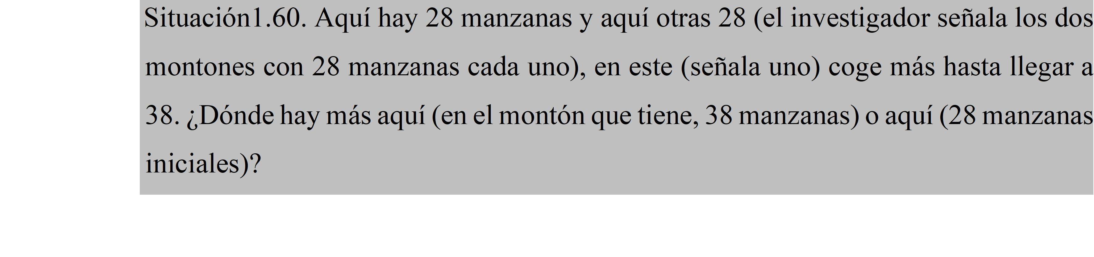 Pe (5:3) es un niño que ante la cuestión "aqui hay 5 manzanas, coge más hasta llegar a 10" no tiene en cuenta que en esa pila hay 5 manzanas y coge el total de 10 manzanas. Este niño no está en el nivel cadena rompible porque comienza a contar desde 1, además este niño no tiene en cuenta que un conjunto puede estar formado por partes y que la reunión de esas partes da el total, ya que la pila de 5 manzanas ya forma parte del nuevo conjunto de 10 manzanas.