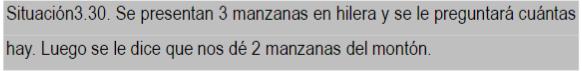 Si falla en la primera parte de la situación3.30, es decir, no da la respuesta correcta a la pregunta de cuántas manzanas hay en una fila de tres, los errores que consideramos serán los mismos que para la situación2.30. Si falla en la segunda parte, es decir, no toma exactamente dos manzanas del montón, los errores que consideramos son los siguientes: