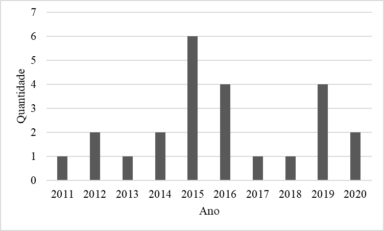 Inicialmente, identificamos em que período se concentraram as pesquisas que envolvem criação, pelos estudantes, de problemas matemáticos. O Gráfico 1 apresenta a distribuição histórica da produção analisada neste estudo.