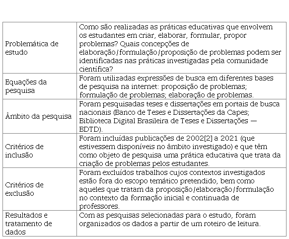Nessa direção, buscou-se analisar, por uma revisão sistemática, as práticas de elaboração, formulação e proposição de problemas a partir da produção científica brasileira, dissertações e teses, que as tenham como objeto de pesquisa em atividades educativas desenvolvidas, a fim de retratar novas compreensões acerca do objeto de estudo. Para orientar a revisão, elaborou-se um protocolo, apresentado no Quadro 1.