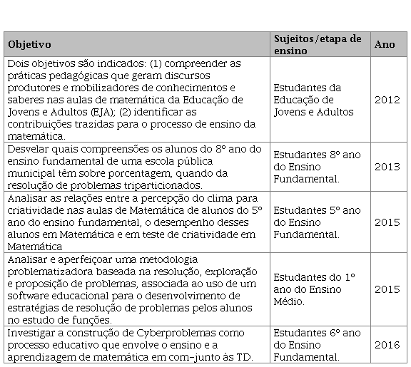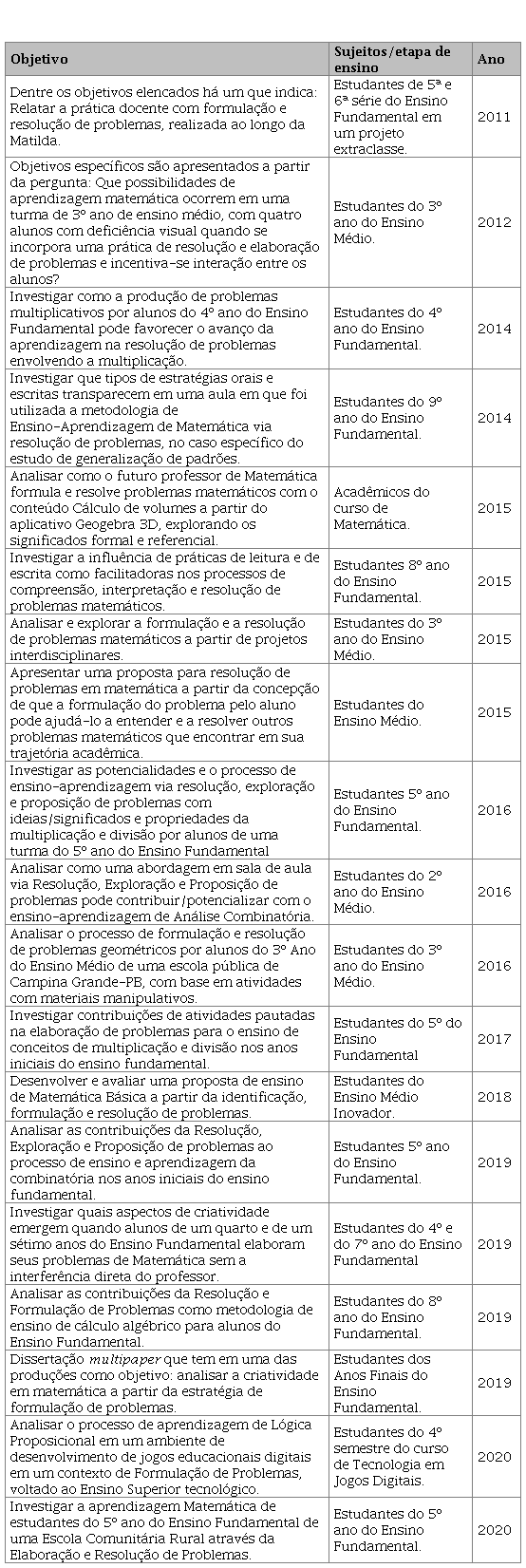 Das 24 pesquisas inventariadas, 19 constituem estudos cujo objetivo envolvia, pelo menos em parte, a criação de problemas pelos estudantes. O Quadro 2 apresenta os objetivos gerais dessas pesquisas, bem como os sujeitos/etapa de ensino envolvidos na elaboração dos problemas e o ano de publicação.
