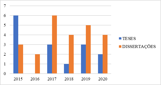 A quantidade de publicações defendidas no período de 2015 a 2020 é apresentada no Gráfico 2. Analisando os dados, percebeu-se que a produção de dissertações de mestrado vem superando, em números, a de teses de doutorado, com a ressalva para 2015, único ano em que a produção de teses ultrapassou a de dissertações. Também foi possível notar que o número de trabalhos de doutorado se mantém oscilando ao longo dos anos em valores relativamente baixos, nunca ultrapassando o quantitativo de três teses defendidas por ano. De fato, das 24 instituições brasileiras nas quais encontramos pesquisas na área, apenas 11 apresentaram teses de doutorado (UNICAMP, USP, UNESP, UFMG, ULBRA, UFPR, UFPI, UFPE, PUC-SP, PUC-RS, UFSC e UNICSUL). Além disso, foi possível destacar o pico observado na produção de teses em 2015, se repetindo em 2017, com 9 publicações. Esse número reduziu em 2016 para dois trabalhos, acontecendo a mesma situação em 2018, com a marca de cinco pesquisas. Porém, em 2018 voltou a crescer para oitos trabalhos. A produção acadêmica, que estava assumindo uma postura crescente em 2019, sofreu uma queda em 2020, fato mostrado no Gráfico 2. Isso talvez se justifique pela pandemia instalada no Brasil, situação que impediu a realização de trabalhos de campo pelos pesquisadores.