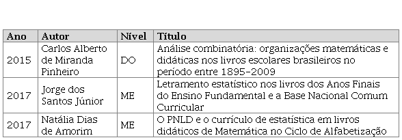 A dissertação de Jorge dos Santos Júnior (2017) teve como escopo identificar elementos para o desenvolvimento do letramento estatístico proporcionado pelos livros didáticos dos Anos Finais do Ensino Fundamental. As três coleções foram: “Praticando Matemática”, “Vontade de Saber” e “Compreensão e Prática”. O autor inferiu que as coleções analisadas permitem ao aluno alcançar, respectivamente, os níveis: informal, consistente não crítico e inconsistente de letramento estatístico, propostos por Watson e Callingham (2003). Entretanto, não possibilitam um pleno desenvolvimento do letramento estatístico, como estabelecido por Gal (2002). O autor evidenciou algumas lacunas que os livros precisam preencher para que fiquem em consonância aos componentes curriculares da BNCC.