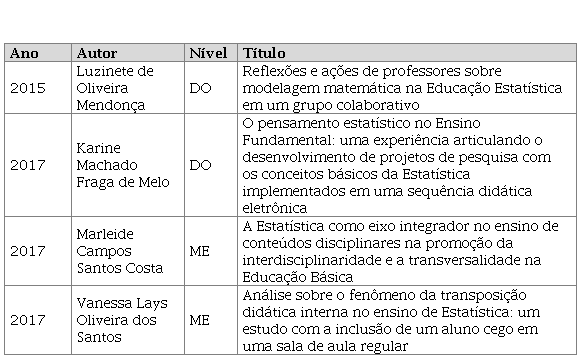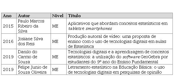 O estudo de Paulo Marcos Ribeiro da Silva (2015) investigou aplicativos que pudessem ser utilizados no ensino de Estatística na Educação Básica, em função de aspectos técnicos, pedagógicos e estatísticos. Já Josiane Silva dos Reis (2016) e Danilo do Carmo de Souza (2019) focaram em propostas metodológicas para o ensino de Estatística com grupo de estudantes do 9º ano. Felipe Junio de Souza Oliveira (2019) investigou o uso de tecnologias digitais, suas contribuições e limitações em pesquisas de opinião baseadas no programa Nossa Escola Pesquisa Sua Opinião (Nepso), para uma aprendizagem em Estatística de estudantes do 8º ano.