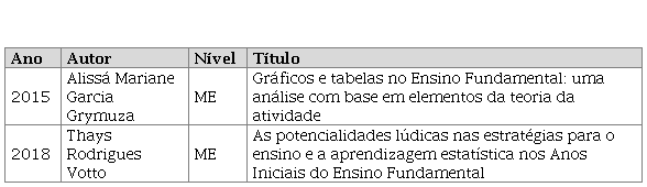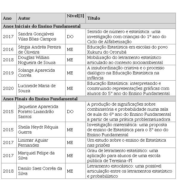 No âmbito dos Anos Iniciais do Ensino Fundamental, no Ciclo de Alfabetização, temos a tese de Sandra Gonçalves Vilas Bôas Campos (2017), que investigou de que forma a Educação Estatística contribui no desenvolvimento do sentido de número. A dissertação de Solange Aparecida Corrêa (2019) utilizou as narrativas de crianças de 7 anos, em uma classe de 25 estudantes do 2º ano do Ensino Fundamental de uma escola particular em Campinas (SP), como fonte de dados, objetivando analisar elementos argumentativos e identificar ações de insubordinação criativa dos alunos às propostas de atividades com Estatística oferecidas pelo professor.