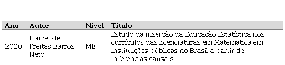 Fernando Gabriel Souza da Silva (2020) identificou a produção de artigos científicos na América Latina no campo do ensino de Estatística. Priscila Germano dos Santos (2020) realizou um estado da arte para determinar a tendência da produção científica por meio da análise dos anais do Encontro Nacional de Educação Matemática (ENEM), de 1987 a 2019.