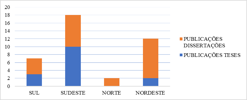 Em relação ao espaço geográfico, os trabalhos foram desenvolvidos em diferentes regiões do Brasil. O Gráfico 1 ilustra esta distribuição: o maior percentual se encontra na região Sudeste com, aproximadamente, 46% dos trabalhos, sendo quatorze no estado de São Paulo, dois no estado do Rio de Janeiro e dois em Minas Gerais. A região Nordeste apresenta 12 publicações, distribuídas em Alagoas, Bahia, Ceará, Paraíba, Pernambuco e Piauí, totalizando cerca de 31% das pesquisas, com uma grande quantidade de trabalhos de dissertações. Na região Sul, foram apresentadas sete pesquisas, sendo quatro no Rio Grande do Sul, uma no Paraná e duas em Santa Catarina, correspondendo a 18% dos trabalhos. A região Norte apresenta 5% dos trabalhos, um no estado do Amazonas e o outro no Pará. A região Centro-Oeste não apresentou trabalhos dentro dessa temática.