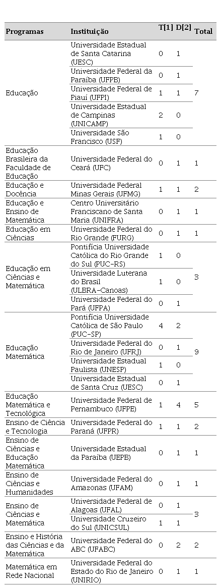 A partir da Tabela 1, observa-se que as teses e dissertações foram defendidas, quase em sua totalidade, em Programas de Pós-Graduação de Educação ou Ensino, com exceção de um trabalho desenvolvido no Programa de Matemática em Rede Nacional. Destaque para a Pontifícia Universidade Católica de São Paulo (PUC-SP), com seis trabalhos e para a Universidade Federal de Pernambuco (UFPE), com cinco trabalhos.
