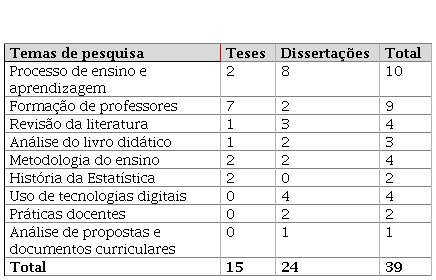 De acordo com Lopes (2003), os temas de pesquisa na área de Estatística apresentam investigações sobre: currículo da escola, formação de professores, tecnologias e dificuldades de aprendizagem. Em nosso estudo, constatou-se que, além dessas linhas, outras estão sendo investigadas. Na Tabela 2, apresentamos os temas de pesquisa que emergiram: processos de ensino e de aprendizagem, metodologia do ensino, história da Estatística, revisão da literatura, análise do livro didático, análise de propostas e documentos curriculares, práticas docentes e o uso de tecnologias digitais.