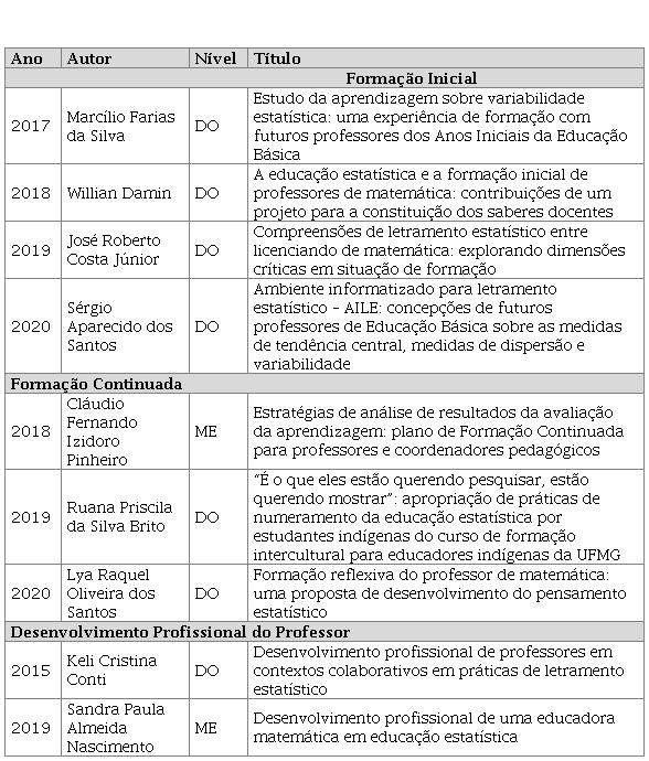 A perspectiva da formação inicial de professores pedagogos foi contemplada em Marcílio Farias da Silva (2017), que visou identificar e caracterizar sinais dos conhecimentos estatísticos que compõem o letramento estatístico. Já na formação inicial de licenciandos em Matemática, temos: Willian Damin (2018), José Roberto Costa Júnior (2019) e Sérgio Aparecido dos Santos (2020). O primeiro realizou uma análise sobre as contribuições de um projeto de ensino de Estatística para o desenvolvimento das competências e para a prática docente; o segundo investigou as compreensões de letramento estatístico no contexto de um curso de formação extracurricular a partir da exploração de dimensões críticas, na perspectiva teórica de Gal; o terceiro desenvolveu um ambiente informatizado voltado para o estudo dos conhecimentos sobre às medidas de tendência central, de dispersão e variabilidade.