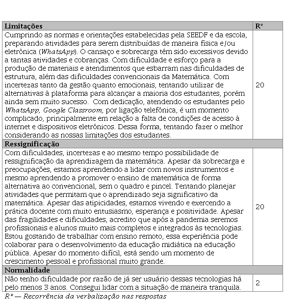 Para investigar o que representou/significou o ensino remoto para os professores que ensinam Matemática no Distrito Federal, este estudo partiu de duas perguntas feitas aos professores e professoras: Como você está lidando com o momento pedagógico atual no ensino remoto? O que representa/significa o ensino remoto para você?