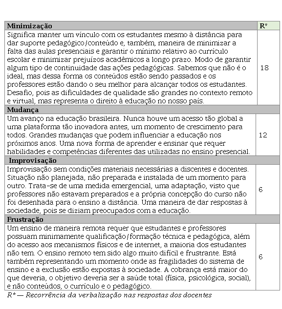 A unidade de análise nomeada Minimização, resultante da categoria Significado do processo de ensino remoto, teve 18 recorrências representativas dos aspectos vinculados ao processo de ensino remoto como uma forma de diminuir os prejuízos acadêmicos causados pelo fechamento das escolas na pandemia.