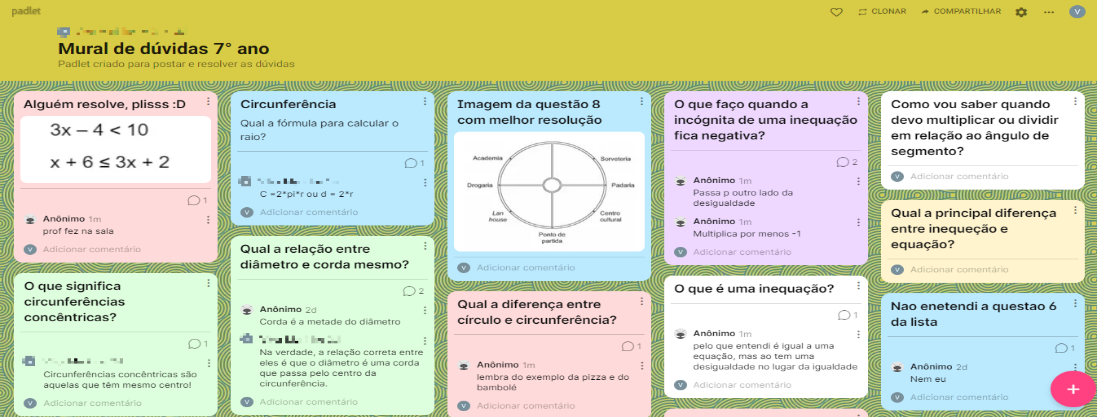 A terceira tarefa teve a finalidade de acrescentar em um fórum as dúvidas que surgissem, de maneira que o professor ou até mesmo os alunos poderiam ajudar. Para esse espaço, escolhemos o Padlet (Figura 2), uma plataforma que permite elaborar quadros com textos, imagens, documentos e vídeos, de forma virtual. Destarte, o objetivo era criar um mural virtual com dúvidas e soluções para que os alunos pudessem acessar para consultar ou contribuir, a qualquer momento, trazendo destaque, mais uma vez, para o potencial colaborativo que buscávamos desenvolver com a metodologia.