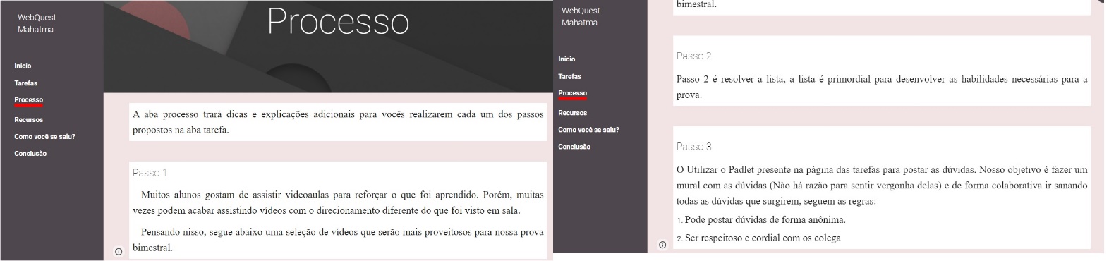 A aba recursos tem a função de trazer os conteúdos necessários para que os alunos percorram o que foi disposto na aba processo, ou seja, tem a missão de fazer com que o aluno consiga resolver as tarefas propostas. Sendo assim, nessa aba, disponibilizamos as videoaulas, que foram cuidadosamente selecionadas, alguns infográficos com resumos do conteúdo e o link que direcionava ao Padlet. A partir desses recursos, os alunos poderiam, de forma investigativa e colaborativa, resolver as tarefas propostas.