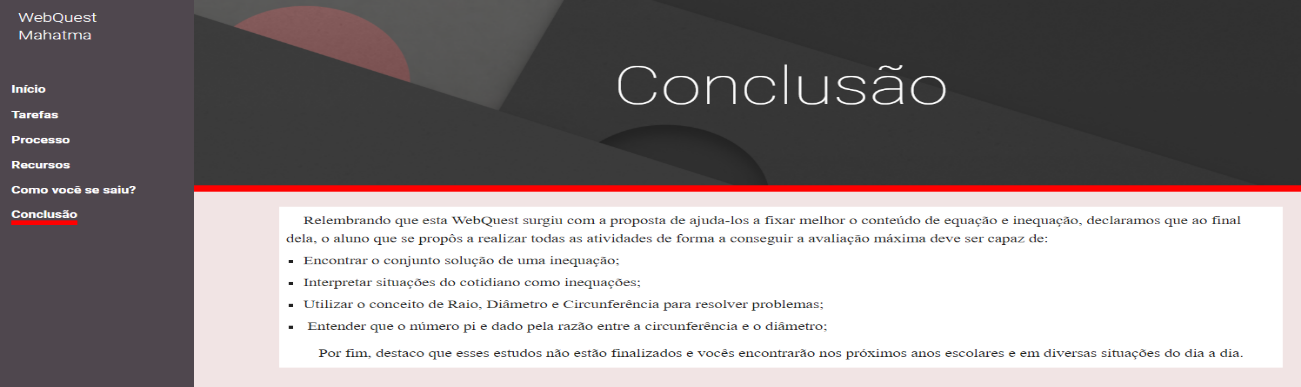 A conclusão da nossa WebQuest carrega a síntese dos conteúdos que devem ser trabalhados e motivações para que o aluno continue estudando acerca do assunto, conforme exibimos na Figura 5.