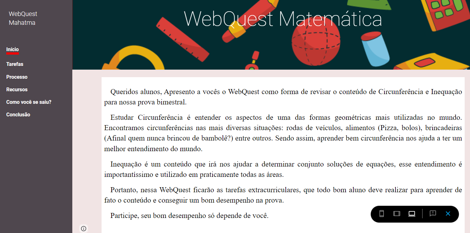 ▪ Etapa 2: Apresentação da WebQuest à turma, mostrando o site, fazendo uma abordagem de como navegar e explicitando que o objetivo dessa atividade era orientá-los melhor para a revisão de conteúdos;