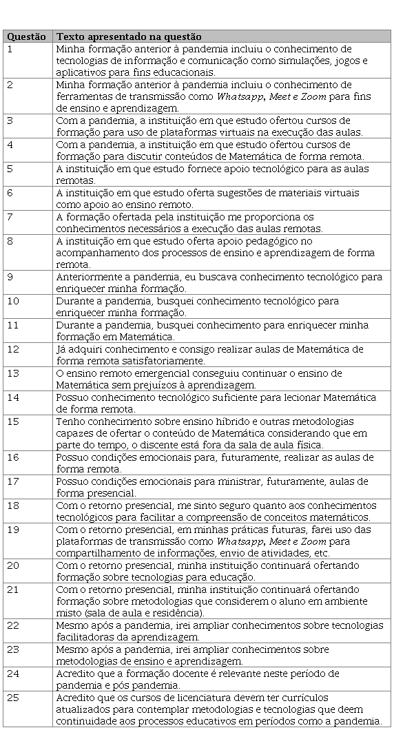 Para atender ao propósito deste trabalho, a pesquisa utilizou um questionário com 25 itens que foram elaborados a partir de vivências em tempos de pandemia trazendo textos sobre as implicações deste período para a formação inicial do professor de Matemática.