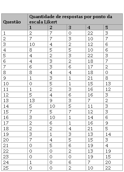 Inicialmente, antes de analisar os dados no software PSPP, foram verificadas a quantidades de respostas em escala Likert para cada item do questionário, conforme ilustra o Quadro 3.