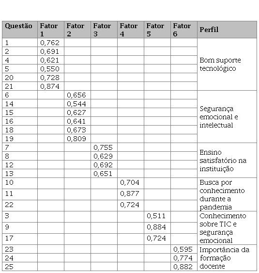 Os valores de cargas fatoriais, apresentados no Quadro 4, foram obtidos no software PSPP a partir da conversão de dados conforme o Quadro 2, de forma que a quantidade de fatores é determinada pela análise. Foram obtidos seis perfis, em que aquele com o maior número de participantes é “Bom suporte tecnológico”, visto que Oliveira, Lima e Silva (2021) relataram que a ordem em que os fatores são apresentados constitui uma escala decrescente em relação à quantidade de respondentes.