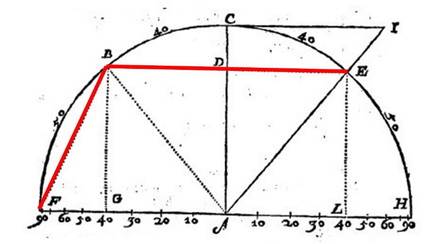 Para construir as cordas e colocá-las em uma mesma escala, o autor traz a seguinte construção: com qualquer distância, descreva o círculo ABCD e trace o diâmetro AC, que forma um ângulo reto com a reta DB. Trace AB, então divida o arco AB em 9 partes de mesma medida. Definindo, assim, as divisões 10, 20, 30, ..., 90, conforme a Figura 6.
