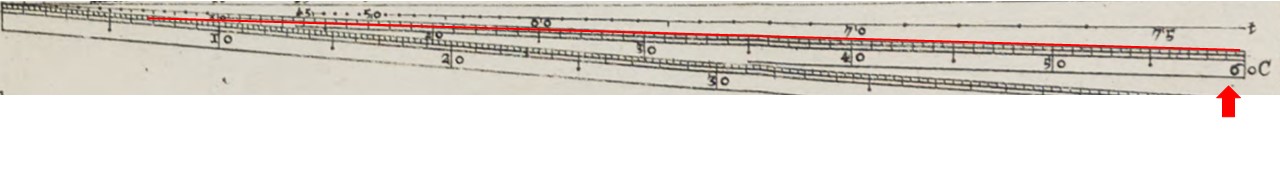 Em seguida, ajustamos o compasso, sem alterar a configuração do Setor, para caber, paralelamente, entre em uma perna do compasso na escala das cordas e na escala das cordas da outra perna, podemos definir a posição das pernas do compasso na escala nos pontos C e D. O comprimento é a corda procurada. Pela Figura 8, que ilustra a situação, o comprimento é a corda referente ao ângulo para o raio que foi usado na construção da escala das cordas.