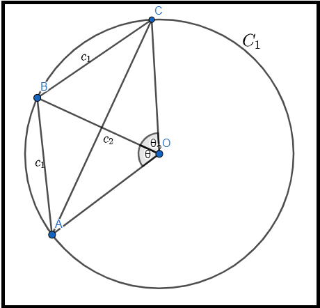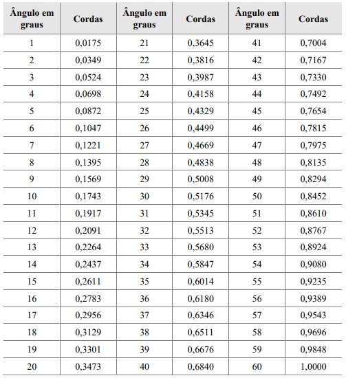 Dada uma circunferência C1, de raio r e centro em O, seja ABC o arco da circunferência, tal que . Seja o comprimento da corda referente ao arco de e como, define a corda referente ao ângulo de . Se a escala das cordas fosse dividida em partes de mesma medida, teríamos , ou seja, o comprimento da corda de seria o dobro do comprimento da corda de . Geometricamente, temos como o exposto na Figura 5.