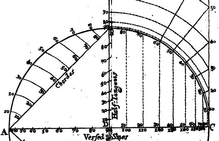 Um pouco mais direcionado, Gunter (1624, p. 42), seu contemporâneo, define corda como um “o segmento de reta que subtende um arco: então BE é a corda do arco BCE, e BF uma corda do arco BF”.