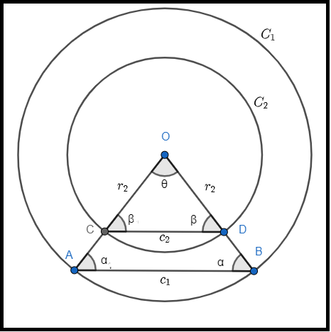 Seja uma circunferência de raio e centro 0, tomemos o arco AB referente ao ângulo . OAB forma um triângulo com , , portanto, isósceles com , e é a corda do arco AB. Seja uma circunferência de raio e centro 0, sendo , OA e OB interceptam em C e D, respectivamente, determinando, assim, o arco CD. Os pontos OCD formam um triângulo com , , à vista disso, isósceles com , e é a corda do arco CD. Podemos representar geometricamente de acordo com a Figura 7.