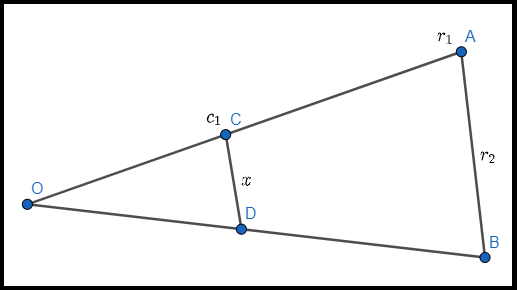 A partir dessa construção, devemos mostrar que é proporcional a , para isso, precisamos dizer que os triângulos OBA e ODC são semelhantes, pois triângulos semelhantes têm seus lados proporcionais. Para demonstrar que isso ocorre, usaremos o seguinte teorema: