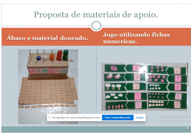 Na segunda etapa, a aula aconteceu de forma assíncrona, e foi destinada para que os alunos assistissem a dois vídeos acerca da contagem, “Contagem e quantidade, a arte de ensinar e aprender” e “Contagem de números — Educação Infantil”, para que respondessem algumas questões, e, posteriormente, construíssem seus próprios matérias manipulativos — ábaco, material dourado e ficha numérica — para apresentarem na aula seguinte para toda a turma.