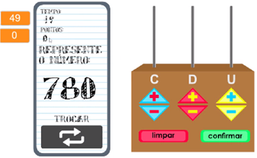 Ainda para os autores, se trata de um material que contribui para a representação das quantidades, deixando mais evidentes as ordens da escrita numérica. Com o ábaco, os alunos conseguem perceber de maneira mais simples os agrupamentos em uma adição, e os recursos para que seja possível realizar a subtração. A Figura 5 trata de um ábaco construido pelo software Scratch, em forma de jogo.