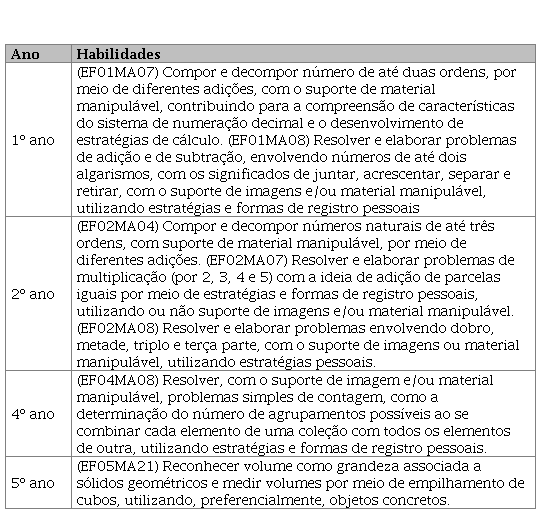 Na Base Nacional Comum Curricular (BRASIL, 2017), por exemplo, é possível identificar as possibilidades de trabalhar com os materiais manipuláveis nos Anos Iniciais do Ensino Fundamental, em algumas habilidades do 1º, 2º, 4º e 5º ano deste nível de escolaridade, como pode ser observado no Quadro 1.