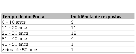 Embora a amostra seja bem diversificada quanto ao tempo de docência e qualificação, apenas um dos entrevistados ainda não atuava na sala de aula. A maioria estava na faixa de 11 a 30 anos de atuação, com larga experiência no ensino, em lidar com instrumentos avaliativos, como podemos constatar na Tabela 2.
