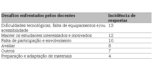 De acordo com os dados coletados e apresentados no Tabela 3, outros desafios também foram citados, como a limitação de atividades práticas realizadas em laboratórios, adaptação no geral, sobrecarga de trabalho, desenvolver estímulos de aprendizagem no primeiro ano do Ensino Fundamental, visto que ainda não possui leitura e escrita, mudanças frequentes nos horários e o isolamento social.