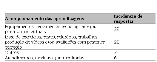 Além disso, os professores fizeram o uso de listas de exercícios, envio de tarefas, TV, provas, produção de relatórios, trabalhos, formulários e produção de vídeos. A maior parte dos professores escolheu mais de uma forma para acompanhar o desenvolvimento dos estudantes. Houve mais benefício nas correções de tais atividades e de encontros para dúvidas, atendimento extraclasse, discussões nas aulas e monitorias (categoria 4). Ainda foram citados atendimentos aos pais, retorno de atividades, participação e materiais que a escola disponibilizava (categoria 3).