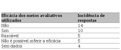 Os professores que responderam que a eficácia das práticas avaliativas foi razoável, fundamentaram suas justificativas na falta de acessibilidade dos estudantes; a motivação; a não saberem como eles resolviam as atividades propostas; e que não é possível comparar com o ensino presencial. Outros disseram não ser possível inferir a eficácia dos instrumentos avaliativos, porque não se pode avaliar algo sem observação; que a grande quantidade de estudantes impossibilitou a análise e que os diversos fatores tornam a questão muito complexa.