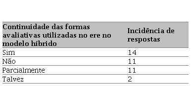 Com relação à eficácia, 14 professores não observaram eficiência nos instrumentos utilizados, no entanto, 10 afirmaram que obtiveram proveito. Logo, muitos professores manterão as formas avaliativas no ensino híbrido. Isto posto, a pesquisa desenvolvida poderá auxiliar os professores em suas ações avaliativas no pós-pandemia, no eventual ensino híbrido.