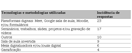 Finalmente, as perguntas: Que tecnologias ou metodologias ativas você utilizou no ensino remoto? Como você avaliaria as opções escolhidas por você nesse contexto?. Sobre elas, alguns professores alegaram que mantiveram aulas síncronas através de plataformas digitais; perceberam maior participação dos estudantes; outros comentaram que os estudantes estavam em atividades paralelas durante os encontros.