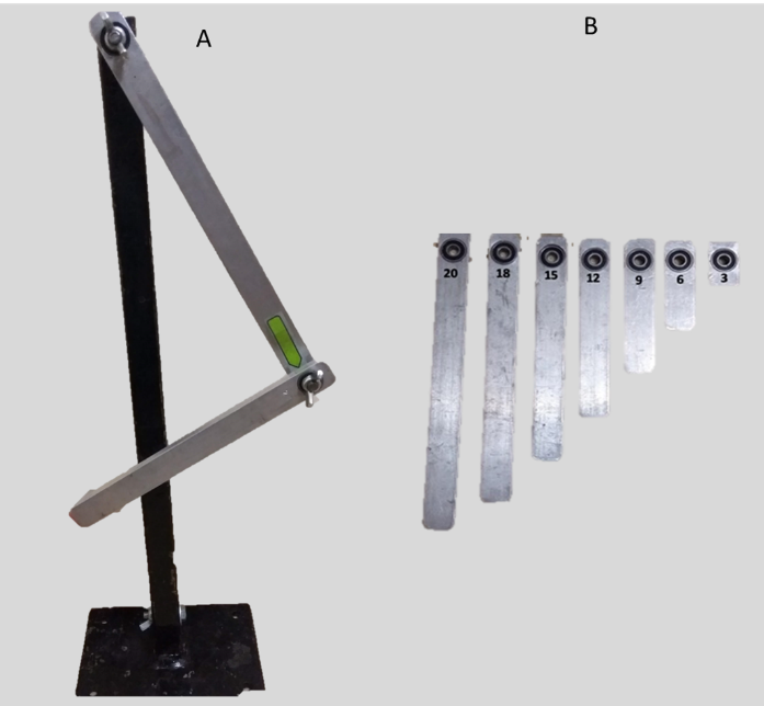 En el marco de la tesis doctoral del primer autor se realizó una puesta en escena para el estudio del movimiento de un péndulo doble (HERNÁNDEZ ZAVALETA, 2019; HERNÁNDEZ ZAVALETA y CANTORAL, 2018). Cada equipo de cuatro estudiantes trabajó con un péndulo doble manipulable de aluminio con barras inferiores intercambiables (ver Figura 1). El movimiento de este péndulo forzado es una situación clásica en el estudio de fenómenos caóticos (DELEANU, 2011; STROGATZ, 1994). Por tanto, es una vía para el estudio de movimientos irregulares difíciles de predecir. Todos los equipos respondieron a las mismas preguntas. El tiempo de las sesiones fue aproximadamente el mismo para todos los equipos (2h y 30 min).