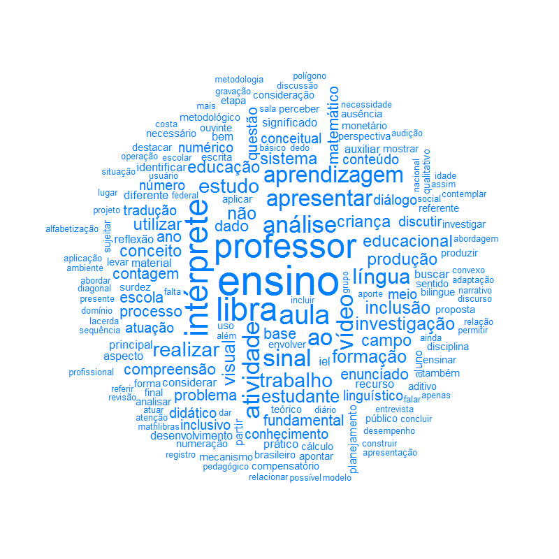 Para identificar as tendências nessas pesquisas, foi adotado o método de análise de conteúdo (BARDIN, 1977), tomando como corpus textual os resumos dos trabalhos. Quando as informações apresentadas nos resumos eram insuficientes para a apreensão dos significados, partiu-se para a leitura do artigo completo. Para apoiar a análise de conteúdo, o corpus também foi tratado no software Interface de R pour les Analyses Multidimensionnelles de Textes et de Questionnaires (Iramutec)[2], que tornou possível gerar uma nuvem de palavras graficamente, em função da sua frequência, conforme Figura 1. Foram suprimidas da nuvem as palavras: “pesquisa”; “como”; “resultado”; “objetivo”; e “artigo”, por entender que são termos comuns em qualquer resumo, além das palavras: “aluno”; “surdo”; “surdos”; e “matemática”, por serem comuns nas pesquisas selecionadas.
