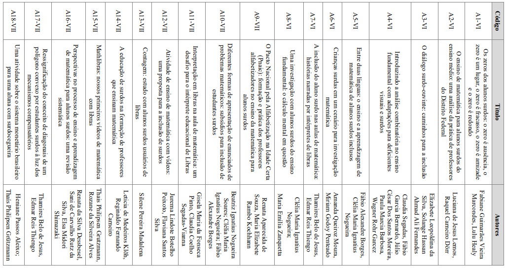 A pesquisa, de cunhos exploratório e bibliográfico, utiliza como fonte os Anais dos VI e VII Sipem[1]. Com foco nas pesquisas relacionadas com Educação Matemática e surdez, acessou-se especificamente o GT13 Diferença, Inclusão e Educação Matemática, de cada uma das edições anteriormente mencionadas, e foram selecionadas oito pesquisas do VI Sipem (2015), das 14 publicadas, e dez do VII Sipem (2018), das 24 publicadas, totalizando 18 publicações, conforme Quadro 1.