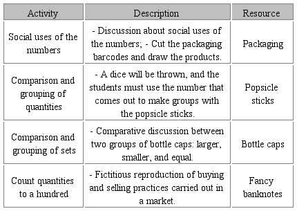 The activities were prepared based on the skills listed in the National Common Curricular Base (BNCC) for the 1st grade of elementary school on the concept of numbers. This idea was pertinent to the development of the research because the intention of a curricular proposal is to generate its implementation and impact on teaching practices and student learning (SACRISTÁN, 2013).
