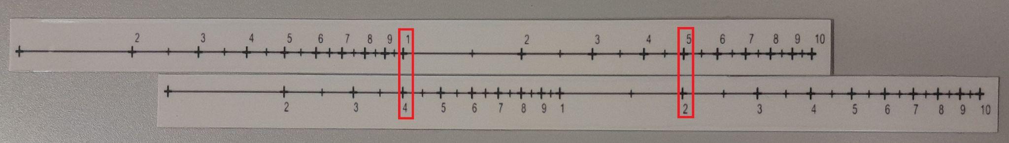 Embora não esteja explícito nas palavras de Oughtred (1639) o uso das réguas através do deslizamento, pelo protótipo construído e pelas orientações dele, concluímos que essa aplicação se dá na forma do emparelhamento das réguas e o produto da multiplicação é obtido por meio do deslizamento delas. Desse modo, quando aplicarmos uma régua na outra o número 1 na Transversarieestará alinhado ao número 4 no Staffe, e o número 5 na Transversarie estará alinhado ao produto esperado (Figura 10).
