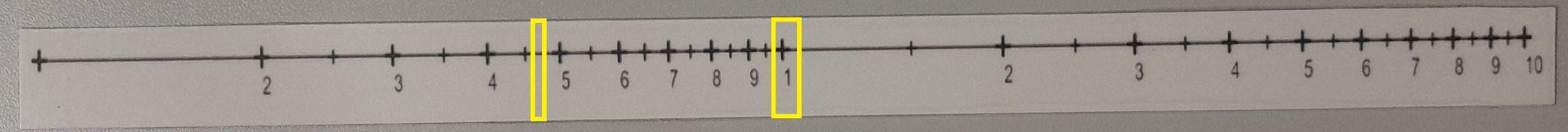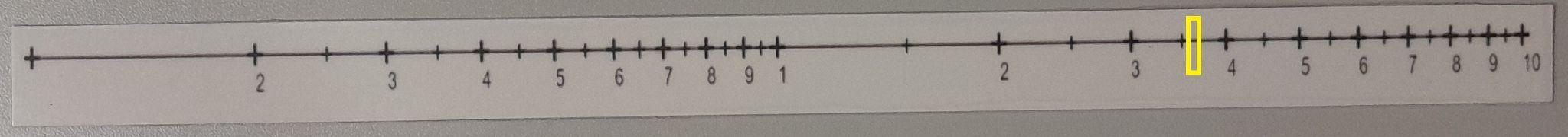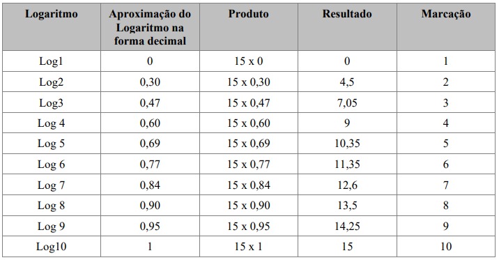 Em vista disso, as distâncias entre os logaritmos terão parte inteira e decimal. Podemos observar, na Figura 6, a marcação do logaritmo de 2 na escala dos números. As duas primeiras marcações da Figura 6 correspondem aos logaritmos de 1 e de 2. Isto significa que a distância da marcação de 1 a 2 equivale ao produto do logaritmo de 2 por 15, ou seja, 4,5.