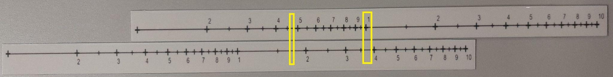 Dessa forma, aplicando o emparelhamento das réguas e o deslizamento entre elas, o número 1 estará alinhado ao número 355 e o número 48 estará alinhado ao produto da multiplicação. Para reconhecer o resultado obtido, o leitor deve realizar a contagem na régua Staffe partindo do fator que está sendo multiplicado até chegar na marcação do produto obtido, ou seja, o número 355 até um número que está entre 10.000 e 20.000.