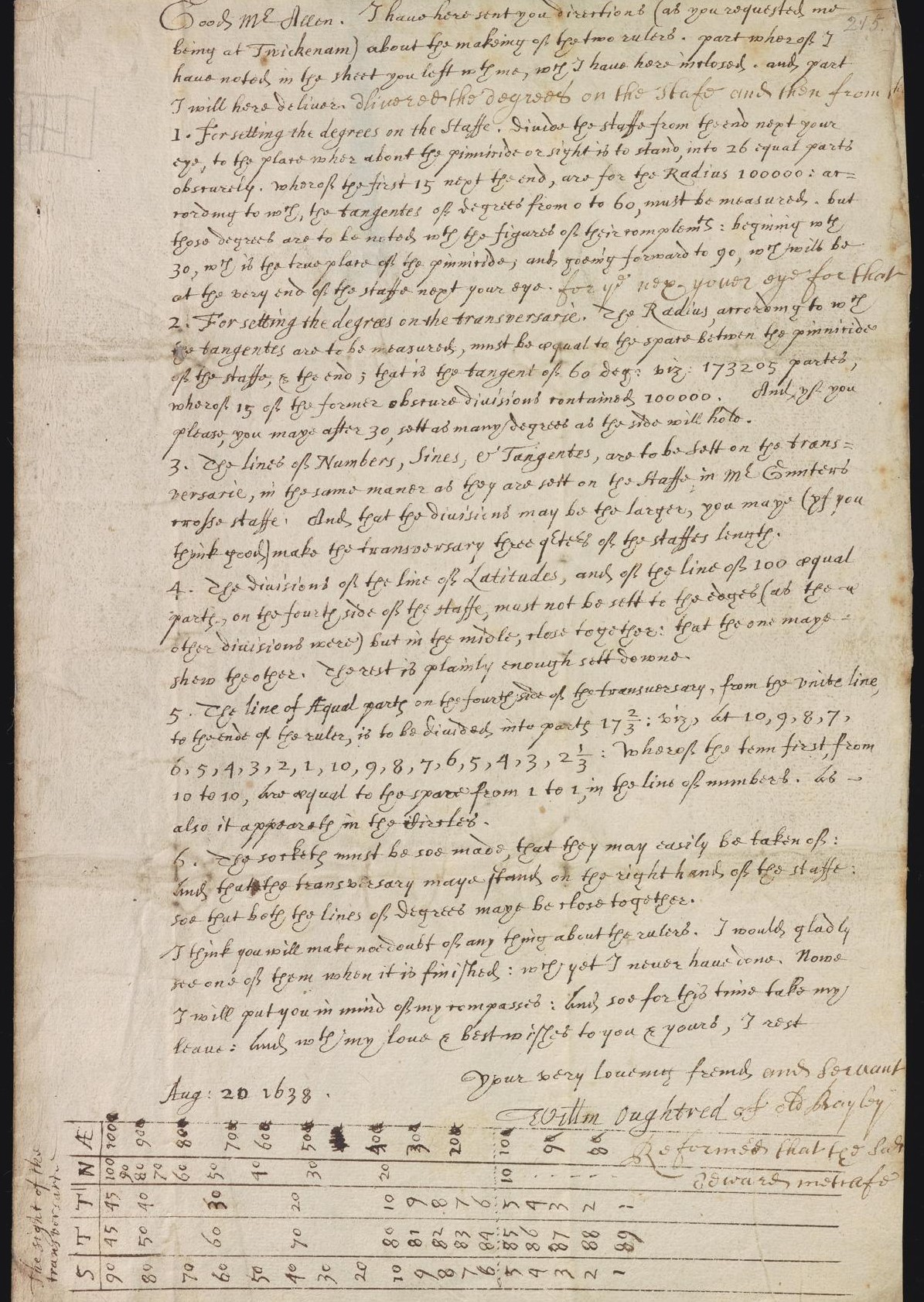 Em 1638, um ano antes de sua publicação como anexo ao tratado The Circles of Proportion and the Horizontall Instrvment, William Oughtred envia uma carta (Figura 2) para o fabricante de instrumentos matemáticos Elias Allen (1588-1653), na qual relata algumas “instruções e orientações a respeito da construção das duas réguas para cálculo” (Lima, Soares e Alves, 2021, p. 31).