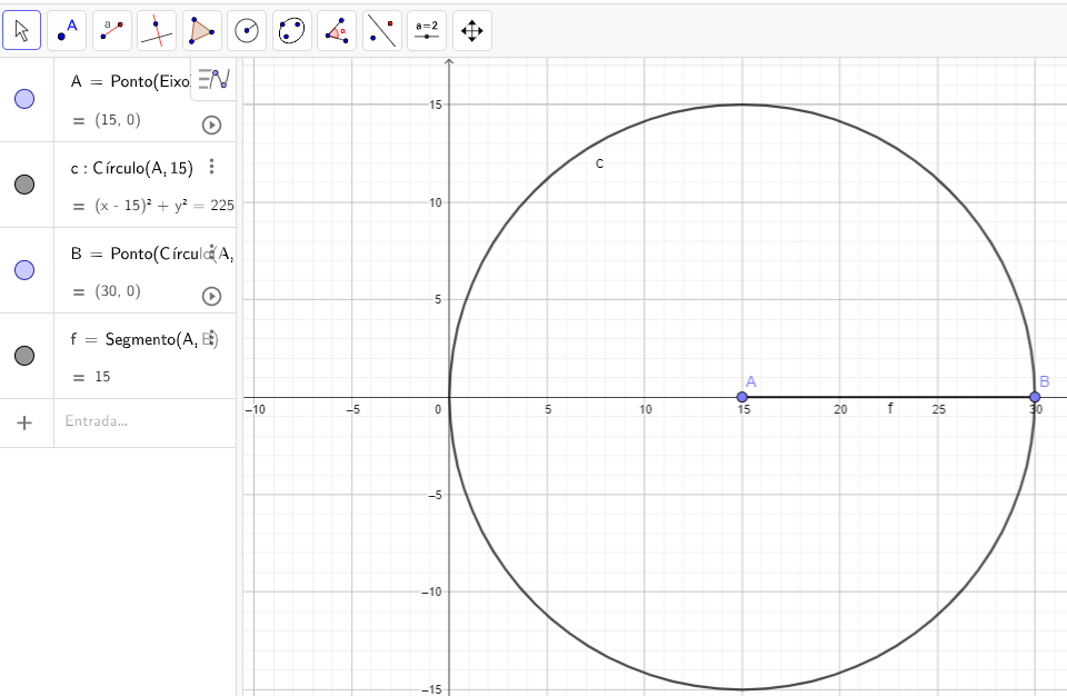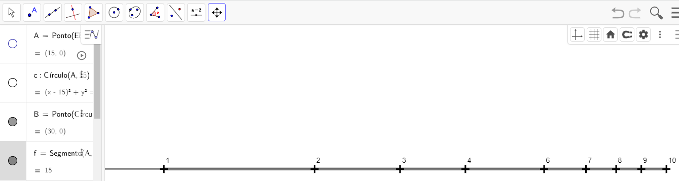 (1) Primeiramente, escolhemos o tamanho da régua Transversarie, para a qual adotamos o mesmo tamanho de uma régua convencional atual, 30 centímetros. Com isso, por meio do comando “círculo centro & raio” no GeoGebra, traçamos o diâmetro que terá o tamanho escolhido para a régua Transversarie. Em seguida, dividimos por dois o tamanho do diâmetro adotado e, com o comando “segmento com o comprimento fixo”, faremos a marcação desse resultado, 15 centímetros (Figura 4).